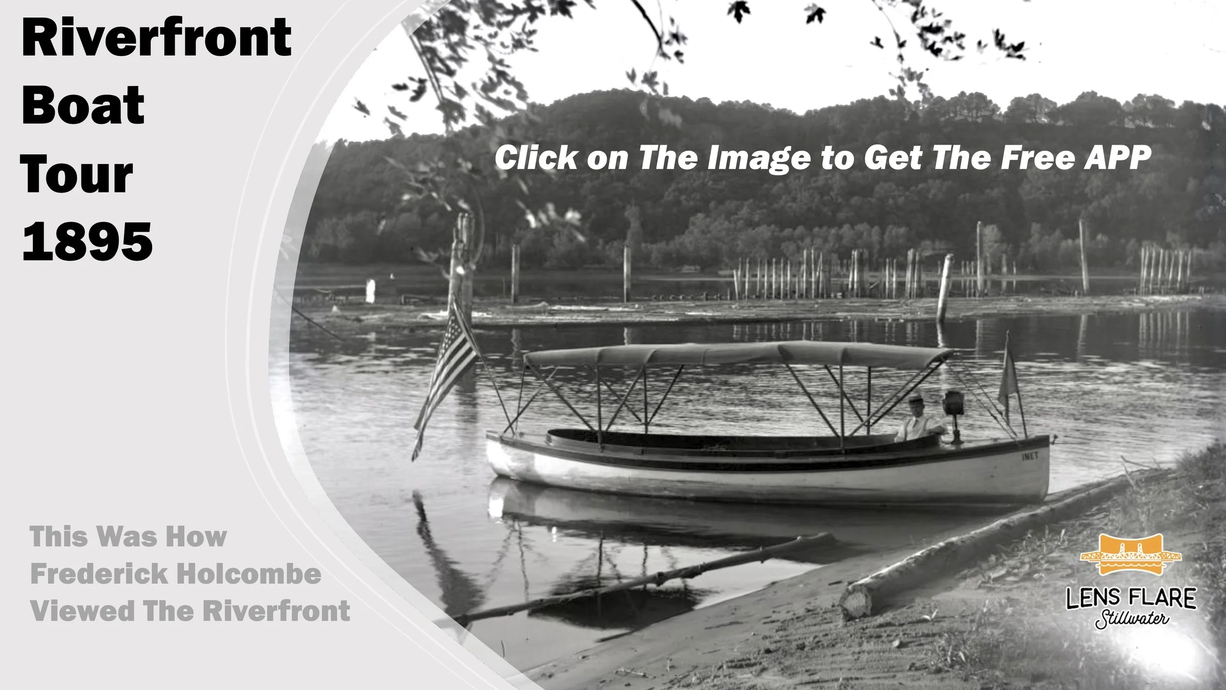 Click on the Image above to Go to The Stillwater Riverfront Boat Tour. This tour features the photographs of Frederick Holcombe taken in the time period of 1895-1900. The photos were taken with glass plate negatives that gave the images high resolution so that you can see the background of his original images in considerable detail. The Tour path is taken from a boat path up the center of the St. Croix River. The tour shows what the riverfront looked like in 1895-1900 as seen from the lens of Frederick Holcomb’s camera. The tour takes you from the south of Stillwater to the Stillwater Boom Site.